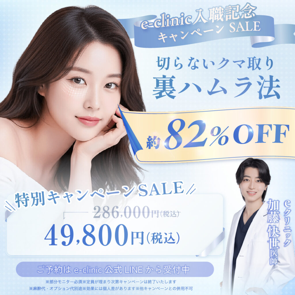 e-clinic 入職記念キャンペーンSALE 切らないクマ取り(経血膜脱脂) \約38%OFF!!/ 通常価格 ¥88,000(税込)特別価格 ¥55,000...