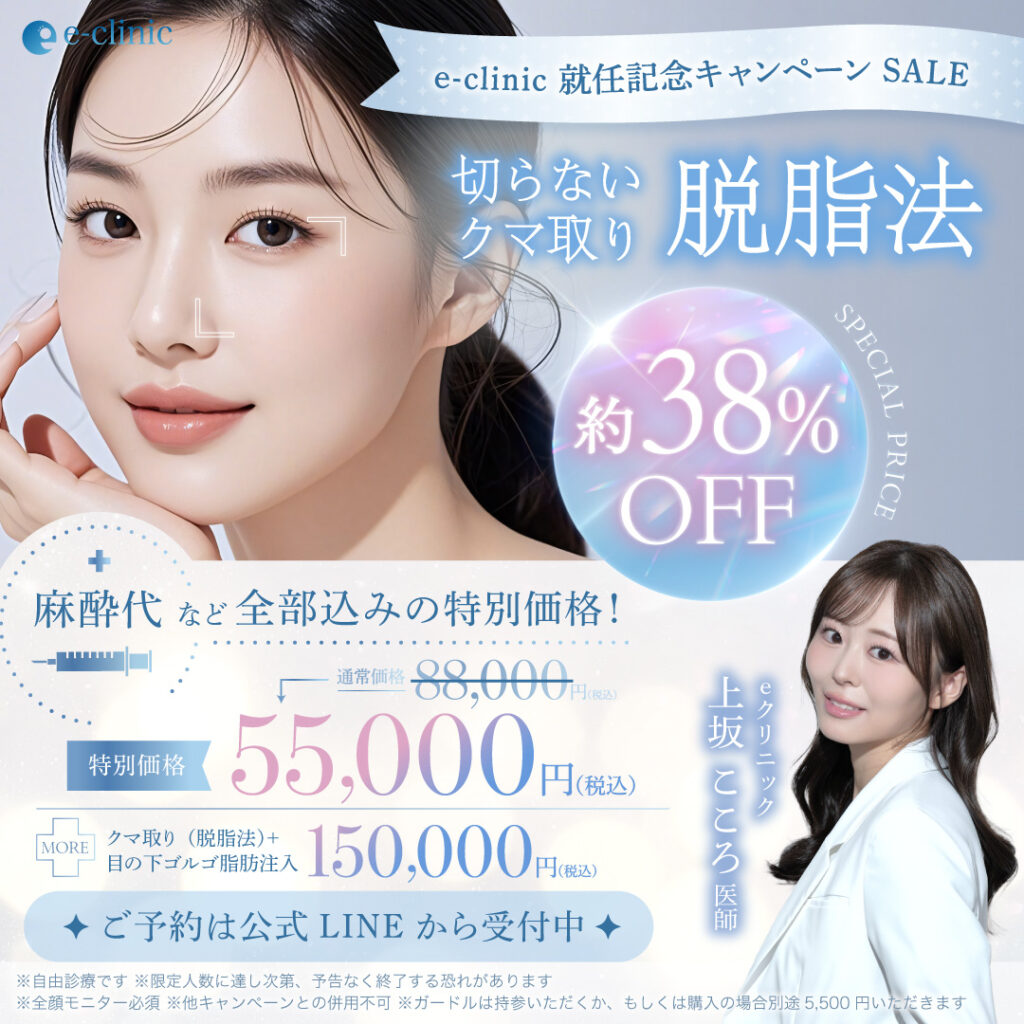 e-clinic 入職記念キャンペーンSALE 切らないクマ取り(経血膜脱脂) \約38%OFF!!/ 通常価格 ¥88,000(税込)特別価格 ¥55,000...